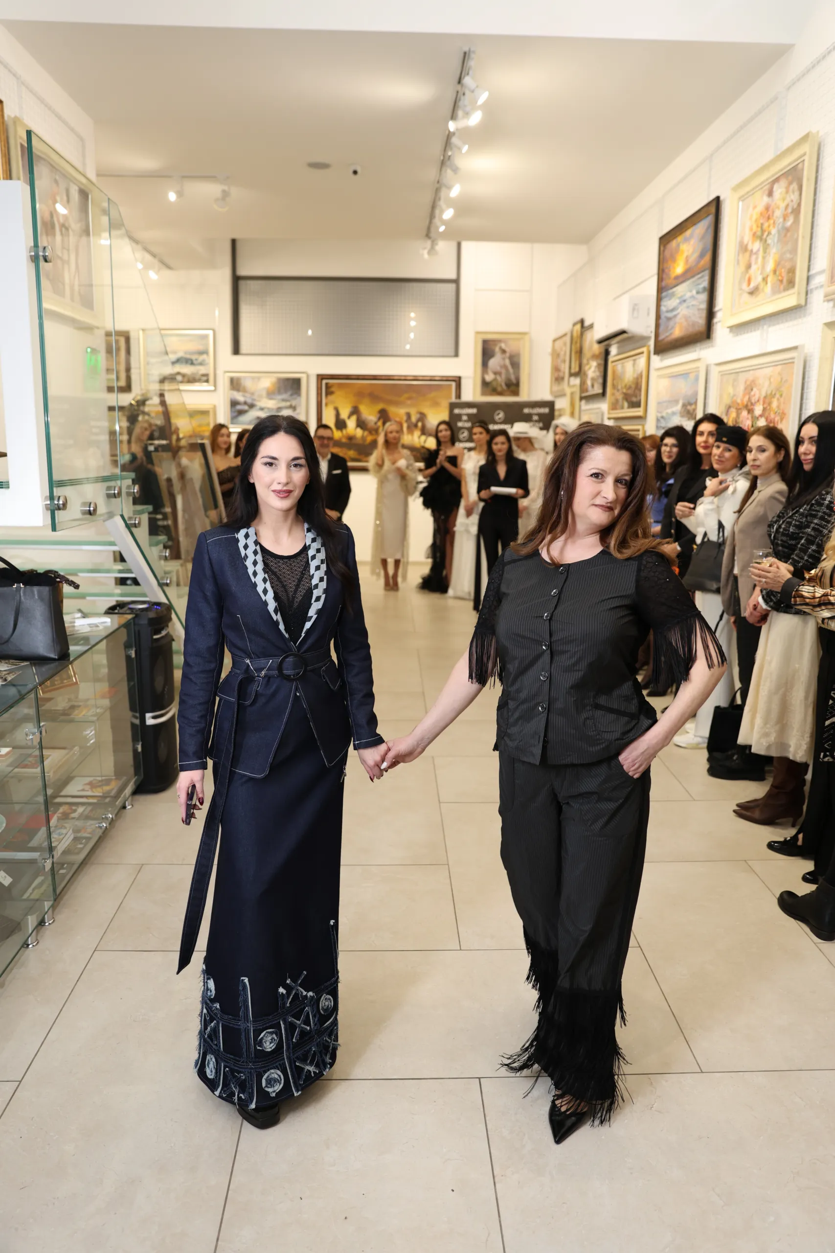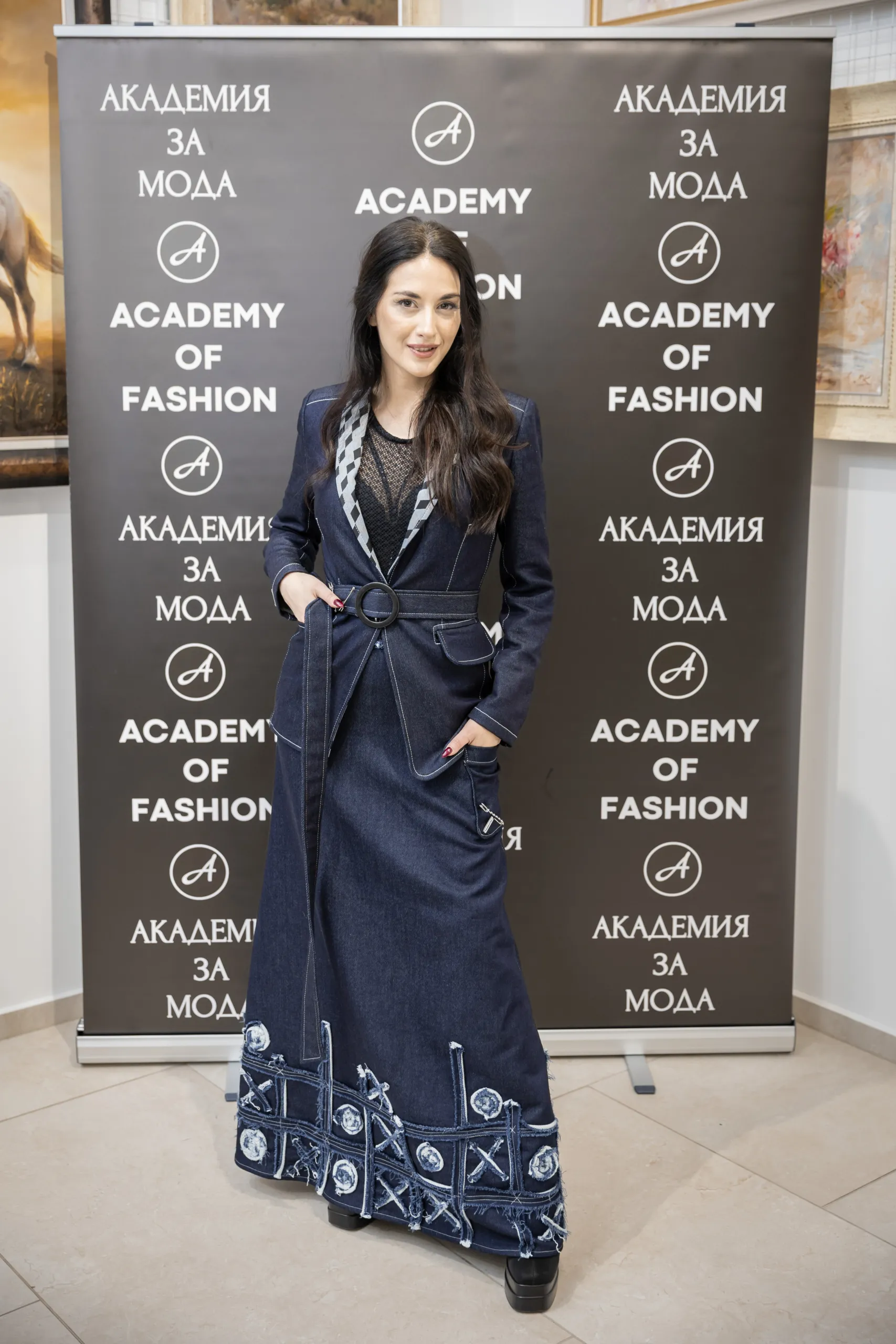 Албена Иванова-Деянова, дизайнер на Benmodel и носител на „Златна игла 2024“ в категория „Прет-а-порте“, представи спортно-елегантен костюм от деним, състоящ се от сако и дълга пола.