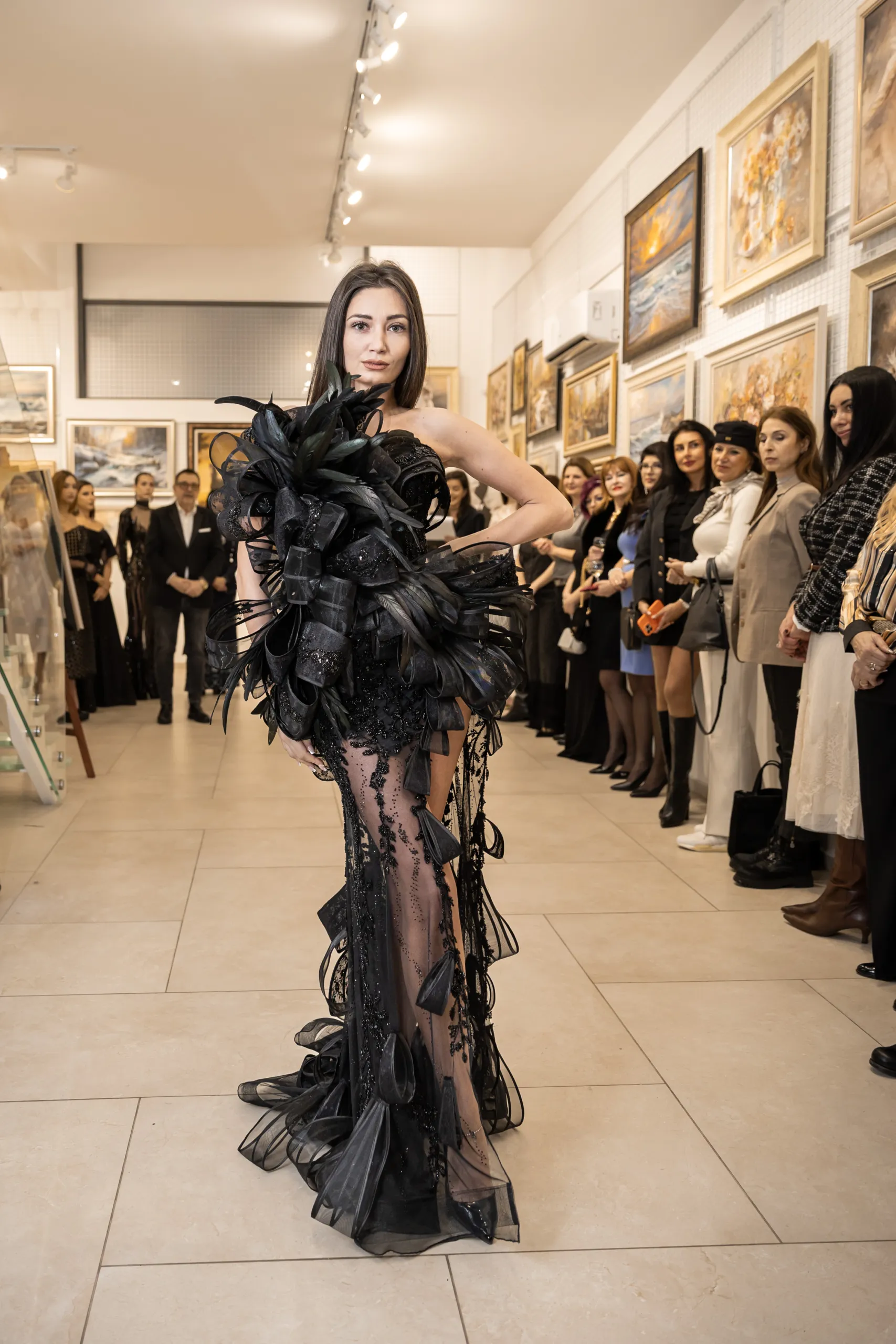 Есил Дюран – дизайнер на Fashion Gallery Esil Duran и носител на „Златна игла 2025“ в категория „Визионерство в музиката и модата“, презентира черна дантелена рокля, в която фин блясък и ефирна прозрачност се преплитат в изискан контраст.